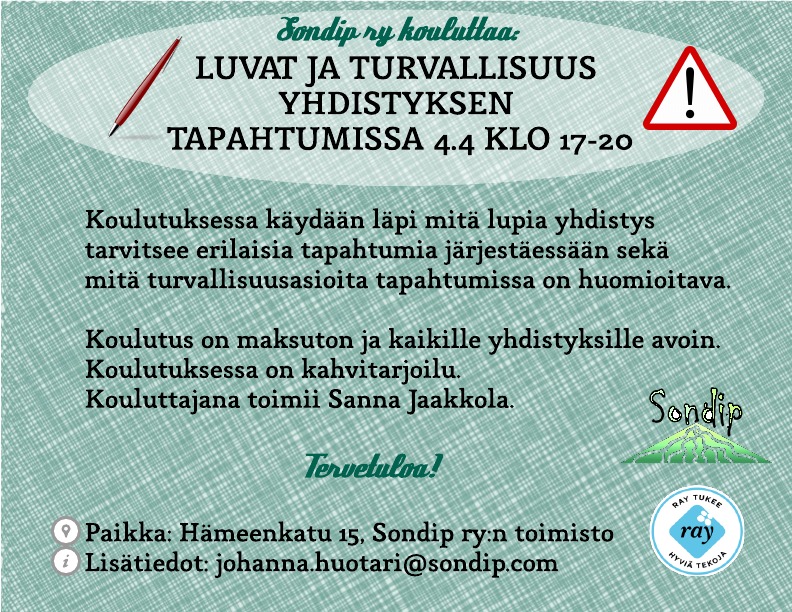 Sondip kouluttaa : Luvat ja turvallisuus yhdistyksen tapahtumissa 4.4 klo 17-20 info-1.4.2016-Koulutukset Tervetuloa Sondip ry:n järjestämään koulutukseen yhdistyksille maanantaina 4.4 klo 17-20. Aiheena yhdistyksille tärkeä: “luvat ja turvallisuus tapahtumissa”. Koulutus on kaikille avoin ja ilmainen sekä sisältää kahvitarjoilun. Tervetuloa mukaan! Artikkelien selaus Edellinen artikkeli Rasisminvastainen juhla 23.3Seuraava artikkeli Kulttuurimatkailua Varissuolla 2-4.05.2016