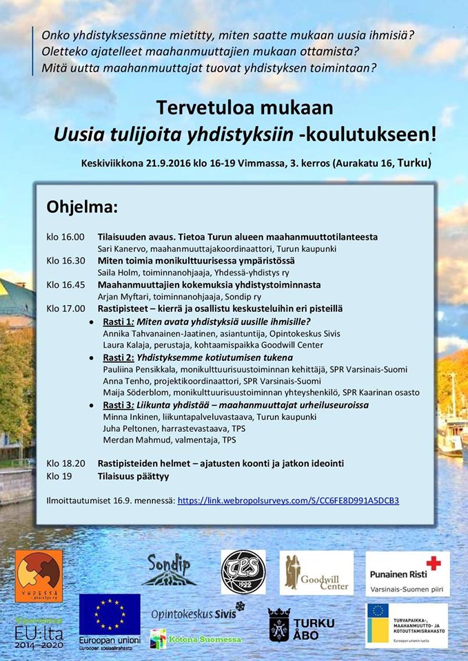 Uusia tulijoita yhdistyksiin-koulutus info-31.8.2016-Koulutukset Onko yhdistyksessänne mietitty, miten saatte mukaan uusia ihmisiä? Oletteko ajatelleet maahanmuuttajien mukaan ottamista? Mitä uutta maahanmuuttajat tuovat yhdistyksen toimintaan? Artikkelien selaus Edellinen artikkeli Sondip ry järjestää : Hyvä toimintasuunitelma-koulutus 27.4 klo 17-20:00Seuraava artikkeli Yhdistys työnantajana-koulutus osa II