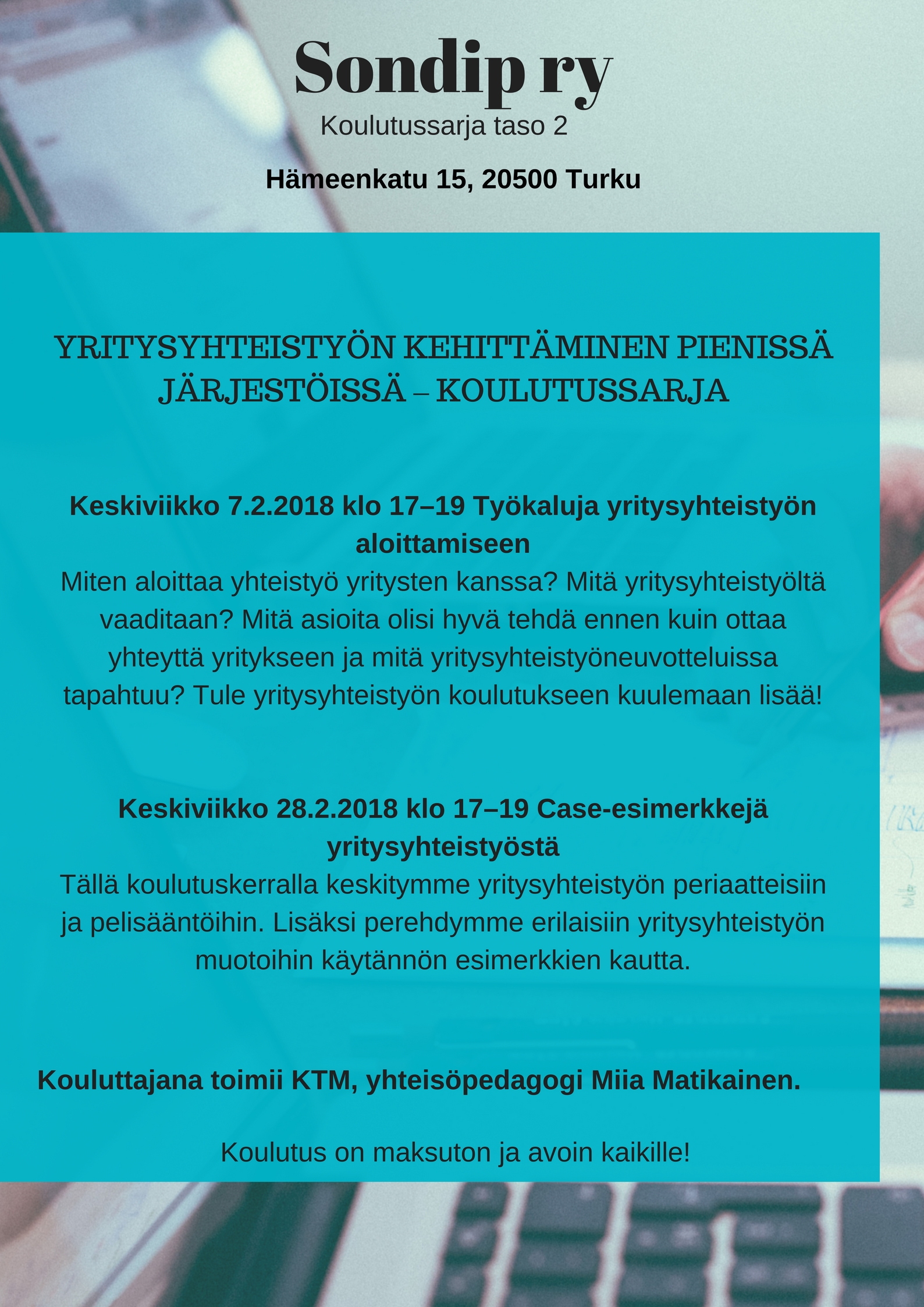 Koulutus on maksuton ja kaikille avoin, sisältää iltapalan ja kahvia.
